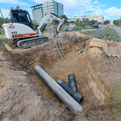 Sanpik installed a 16 inch HDPE sewer forcemain along the Easterly Tibbetts Highway on 2017, three connection points for the Camana Bay area were cut in using Electra fuse couplings and wyes with plug valves at each location